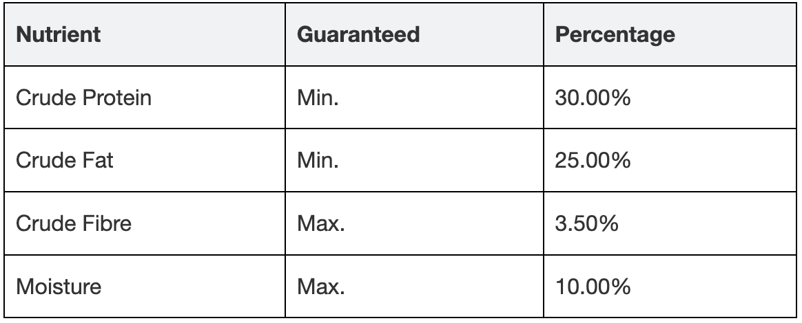 Chicken Meal, Chicken Fat, Herring Meal, Ground Whole Grain Corn, Ground Whole Grain Wheat, Whole Brown Rice, Wheat Shorts, Dried Beet Pulp, Dried Brewer’s Yeast, Herring Oil, Salt, Chicken Liver, Kelp Meal, Potassium Chloride, Lecithin, Chicory Root, Mixed Tocopherols (preservative), Flaxseed, Glucosamine Hydrochloride, Chondroitin Sulfate, Black Malted Barley, Calcium Propionate (preservative), Limestone, Iron Proteinate, Zinc Proteinate, L-Ascorbyl-2-Polyphosphate (Vitamin C), Vitamin E Supplement, Taurine, Manganese Proteinate, Yucca Schidigera Extract, Copper Proteinate, L-Lysine, Selenium Yeast, Vitamin A Supplement, Niacin (B3), Calcium Pantothenate (B5), Biotin (B7), Riboflavin (B2), Thiamine Mononitrate (B1), Vitamin B12 Supplement, Pyridoxine Hydrochloride (B6), Vitamin D3 Supplement, Cobalt Sulfate, Calcium Iodate, Folic Acid (B9)